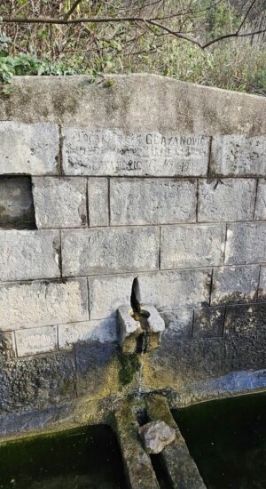 One of the first signs of this route is the “Voda Chipoi 1938” izvor. We were unable to find reliable historical publications that would allow us to confidently describe its origin or the history of its construction. The only reliable confirmation is that this feature is marked in open cartographic databases as a spring named Voda Čiponj 1938, in the Šušanj/Brci area, near the Church of St. Petka and Vela Mogila. Therefore, in this article, it is correct to refer to it as an actual water feature along the route.