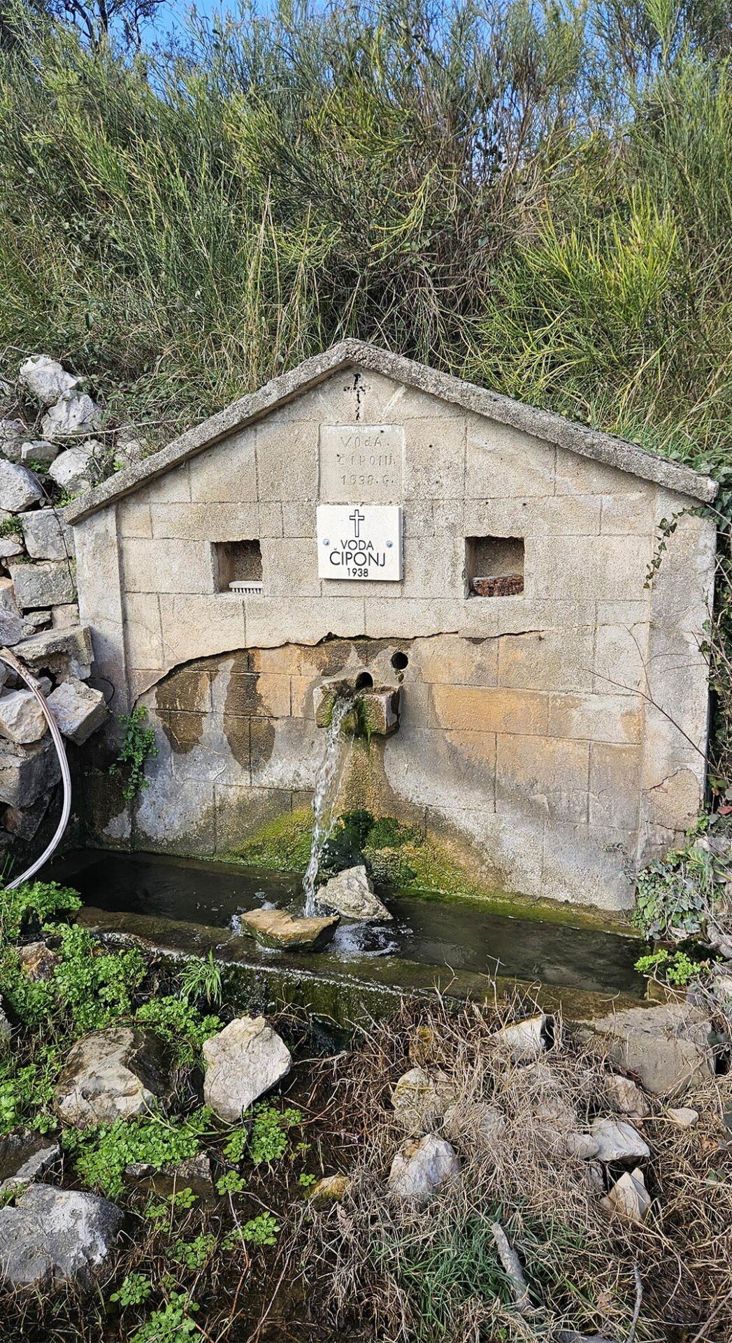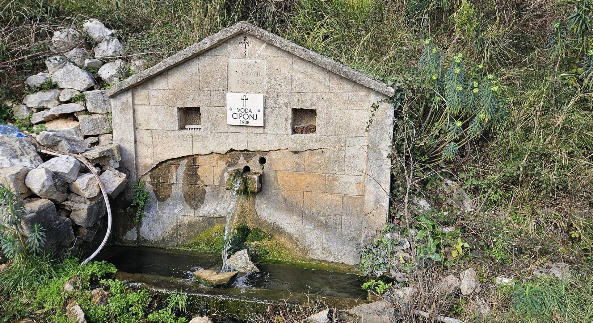 One of the first signs of this route is the “Voda Chipoi 1938” izvor. We were unable to find reliable historical publications that would allow us to confidently describe its origin or the history of its construction. The only reliable confirmation is that this feature is marked in open cartographic databases as a spring named Voda Čiponj 1938, in the Šušanj/Brci area, near the Church of St. Petka and Vela Mogila. Therefore, in this article, it is correct to refer to it as an actual water feature along the route.