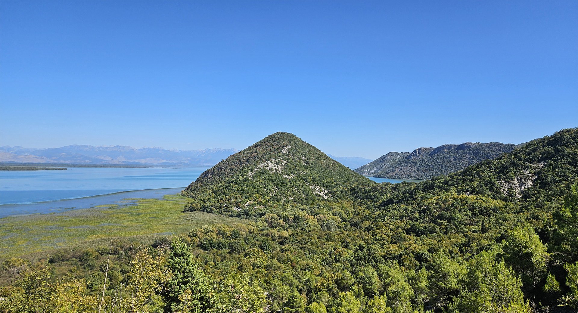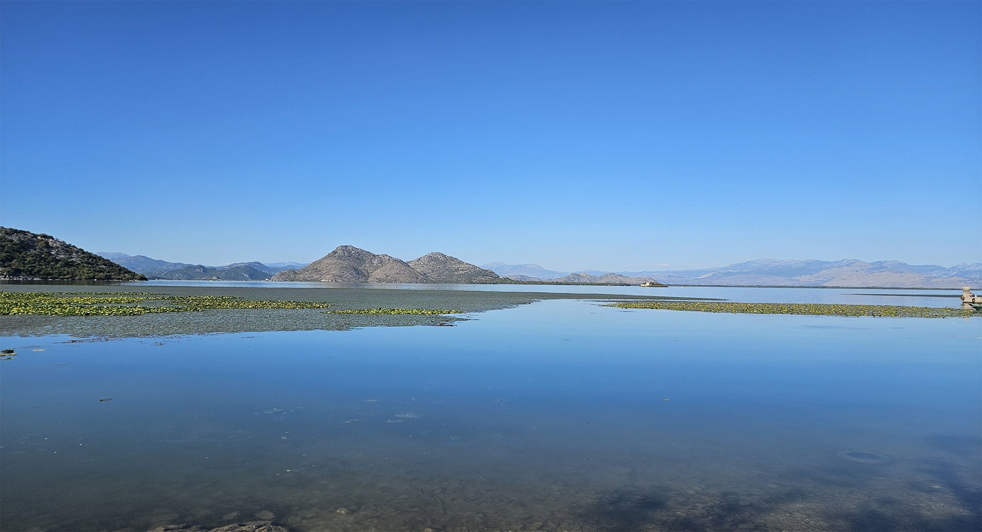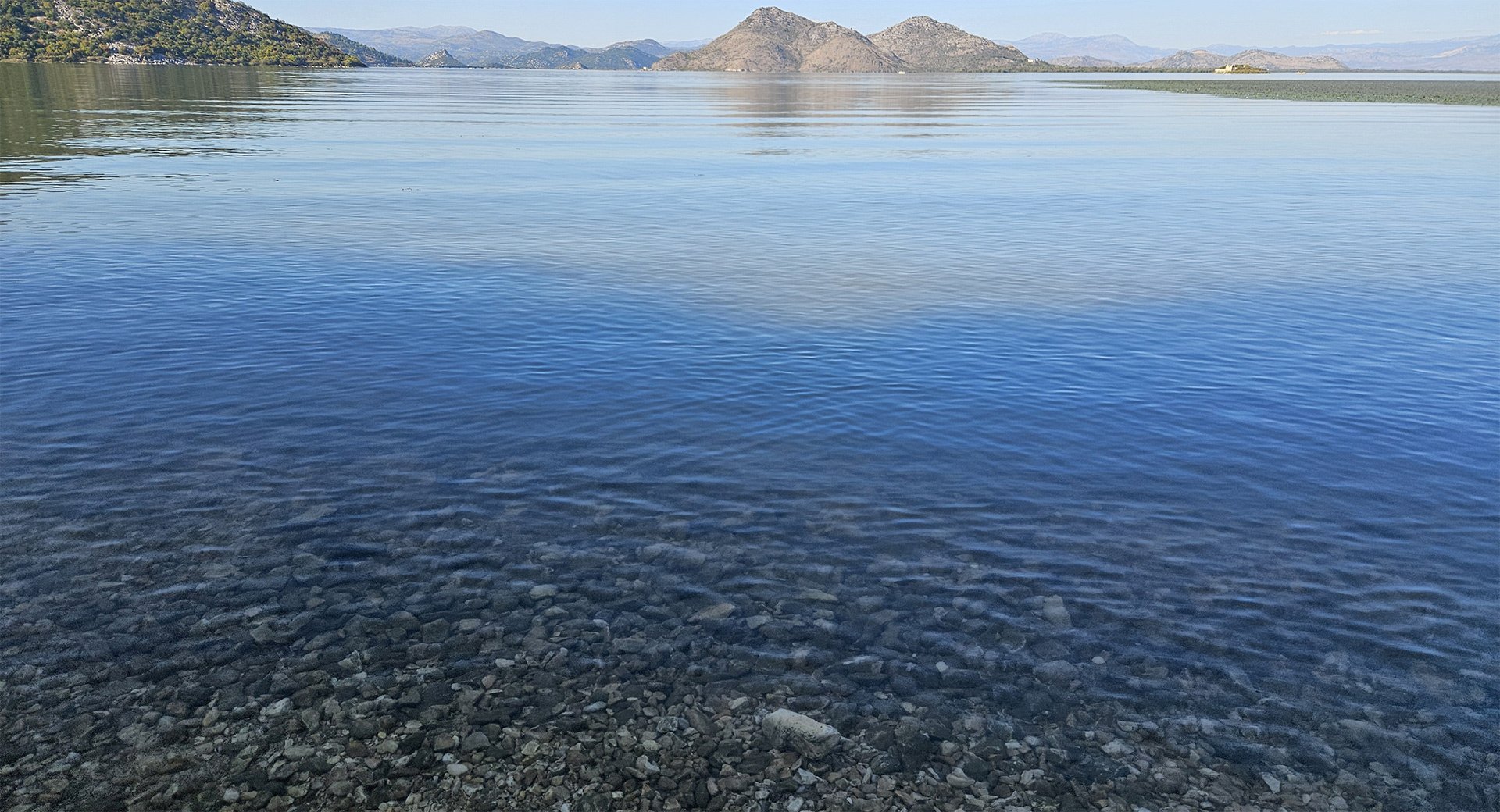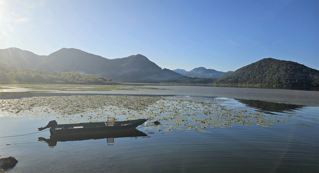 Hydrobotany and Landscapes. Skadar is a shallow (average depth ~5–6 m), seasonally “breathing” lake with floods: in summer, its area is approximately 370 km², and in winter, up to ~540 km². The shores are interspersed with reed and rush belts, willow thickets, and estuarine marshes; karst springs (oka) are characteristic.