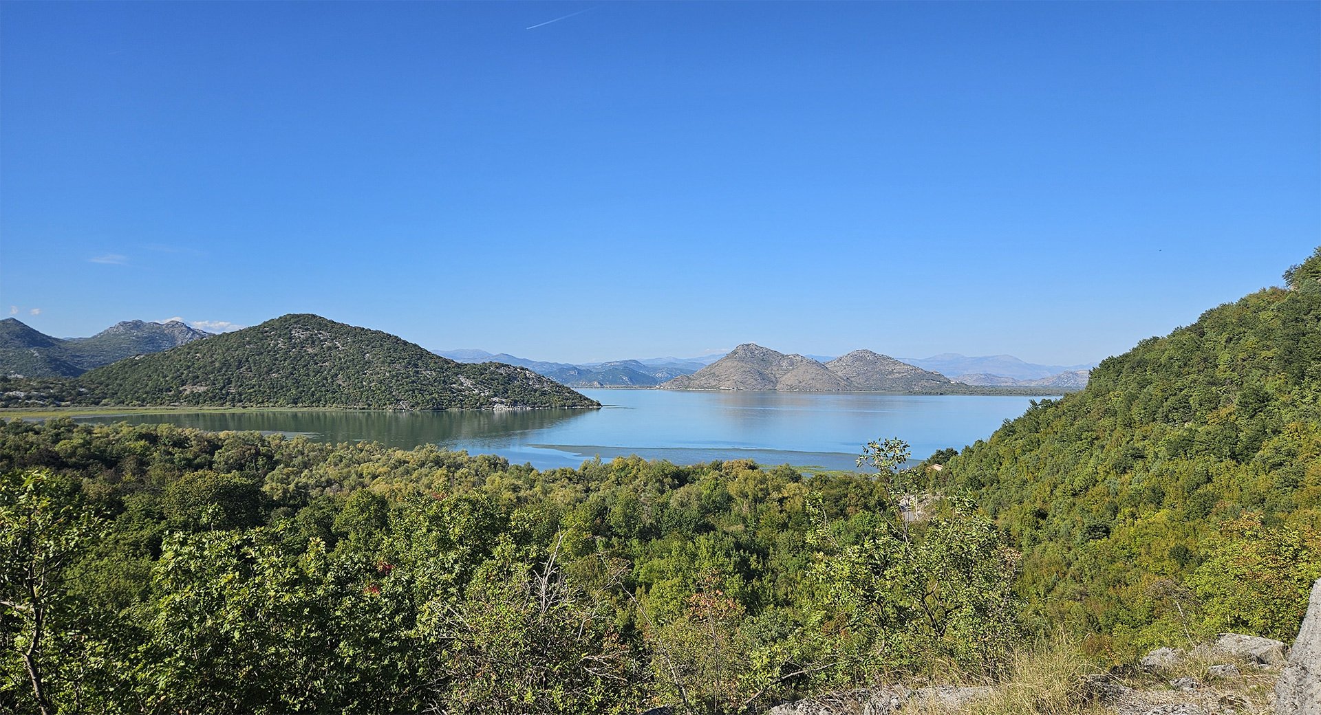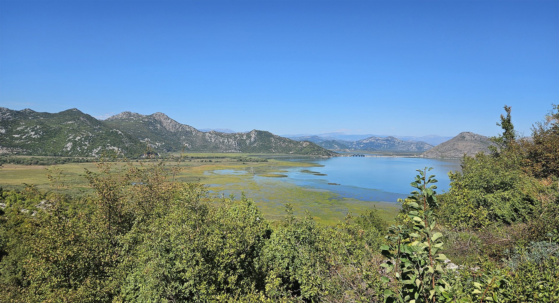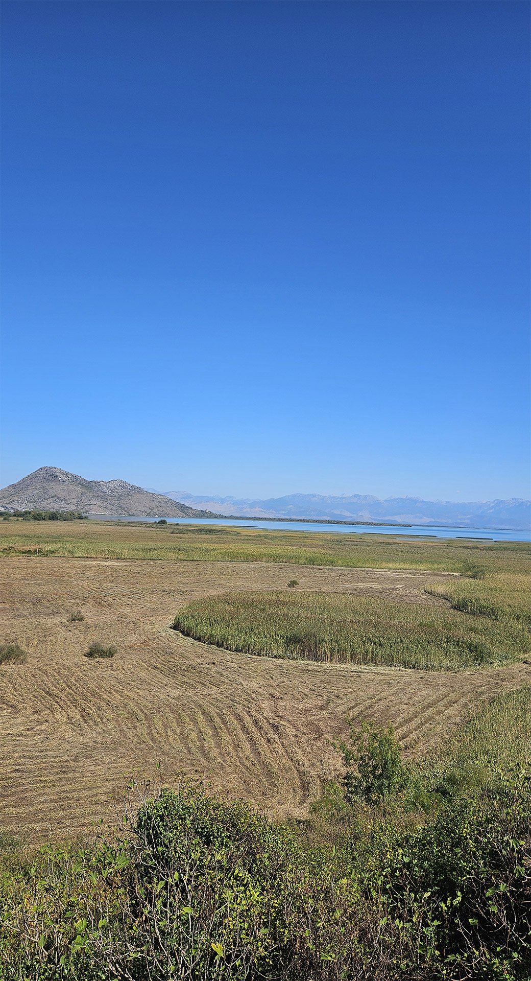 Hydrobotany and Landscapes. Skadar is a shallow (average depth ~5–6 m), seasonally “breathing” lake with floods: in summer, its area is approximately 370 km², and in winter, up to ~540 km². The shores are interspersed with reed and rush belts, willow thickets, and estuarine marshes; karst springs (oka) are characteristic.