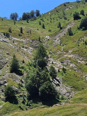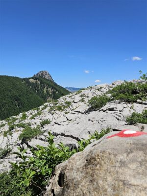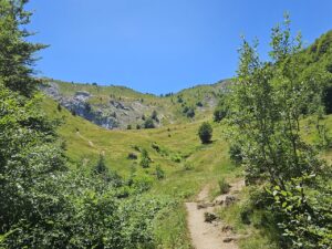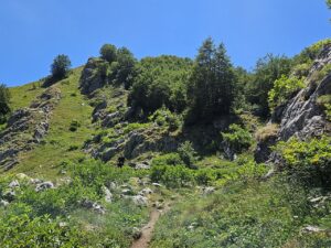 The next day, the group set off from Grebaje Valley toward the summit of Volušnica, which rises to about 1,879 meters above sea level. The trail begins at roughly 1,160 meters near Grebaje Hut (Dom Grbaja), implying a vertical gain of about 719 meters.