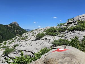 From Volušnica, the trail continues along the ridge to Talijanka, then on to Popadija. This classic loop route spans 10–12 km, with an elevation gain of roughly 1,000 meters, and usually takes 5–6 hours to complete. The route is well-marked with red and white trail blazes. From Talijanka, one can see deep into the Albanian highlands; Popadija offers sweeping views of Karanfili and Ropojanska Vrata.