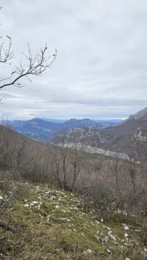 The trail continues to climb in short switchbacks, generally heading west. Occasionally, it emerges into almost level clearings, offering views of the valley with Mikulići below and Rumija, where a church can be seen at the summit.