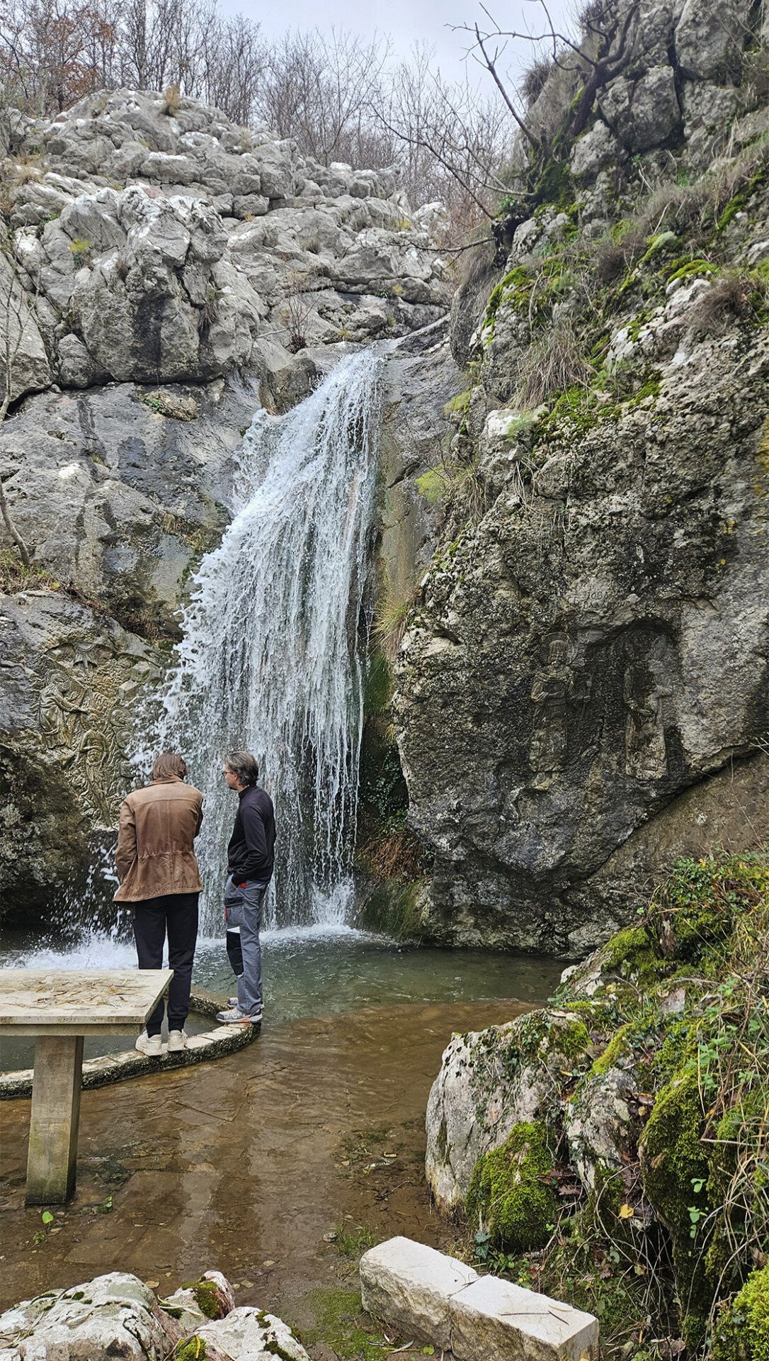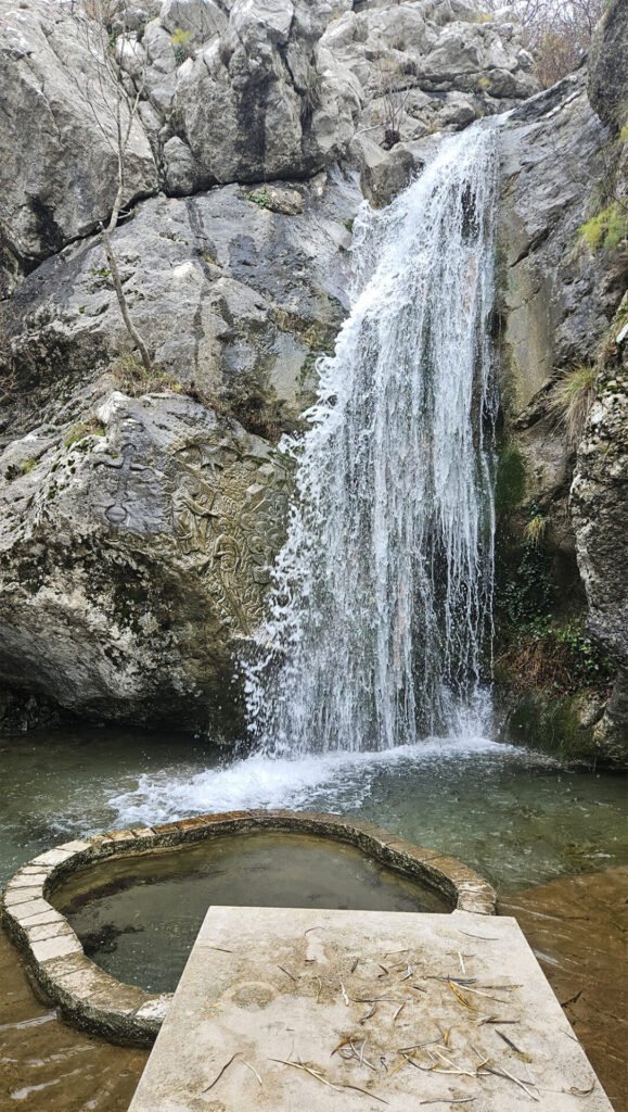 When the spring is full, the water gushes forth in an impressive 10-meter waterfall. There’s a baptismal pool here, and reliefs of Prince Jovan Vladimir and his wife, Teodora Kosara, are carved into the rock, along with a scene of their baptism in the Jordan River. A little further on, the famous cross of Prince Vladimir is carved, which I’ll tell you more about another time.