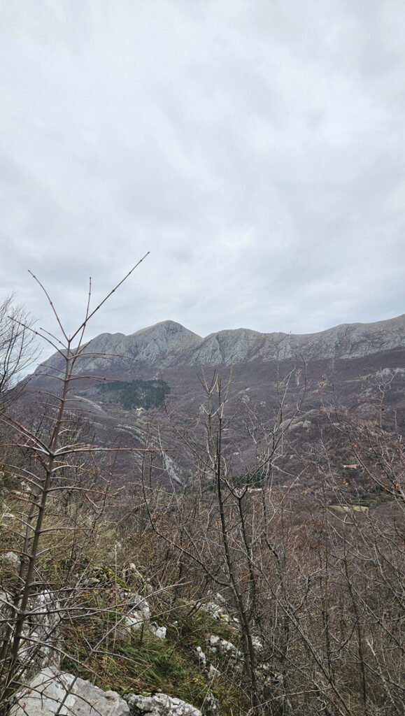 The trail continues to climb in short switchbacks, generally heading west. Occasionally, it emerges into almost level clearings, offering views of the valley with Mikulići below and Rumija, where a church can be seen at the summit.